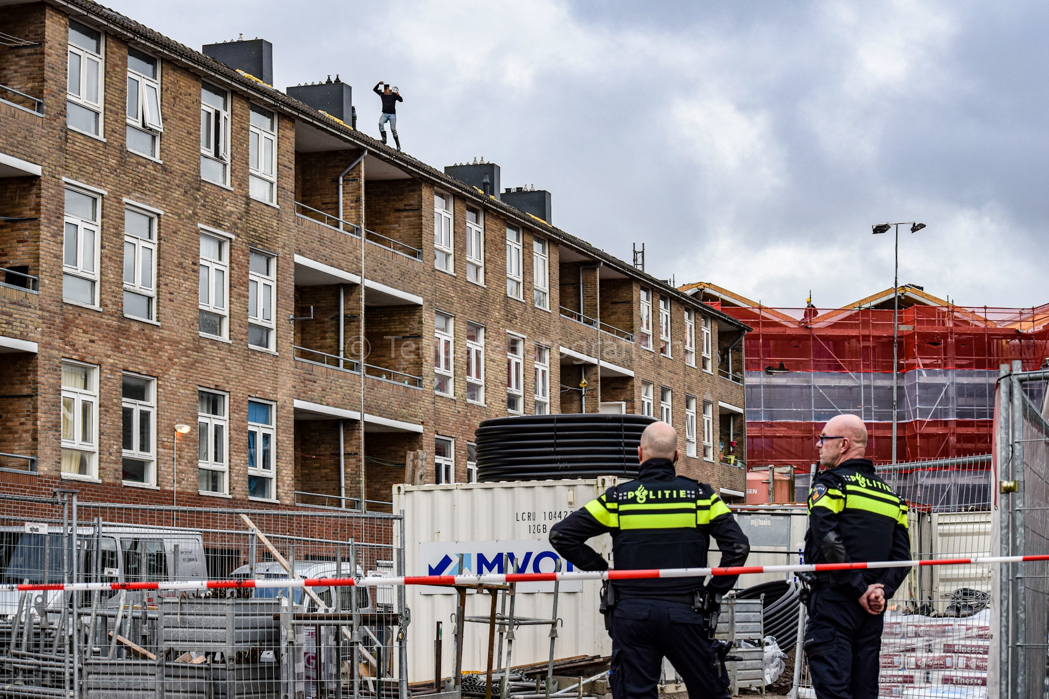 De man is vervolgens het dak opgegaan. Hierop is de ondersteuningsgroep naar de zolder geklommen. Politieagenten konden vanaf een steiger contact met de man krijgen. Daarop besloot hij weer terug te gaan naar de zolder. Hij is daar vervolgens ingerekend.
