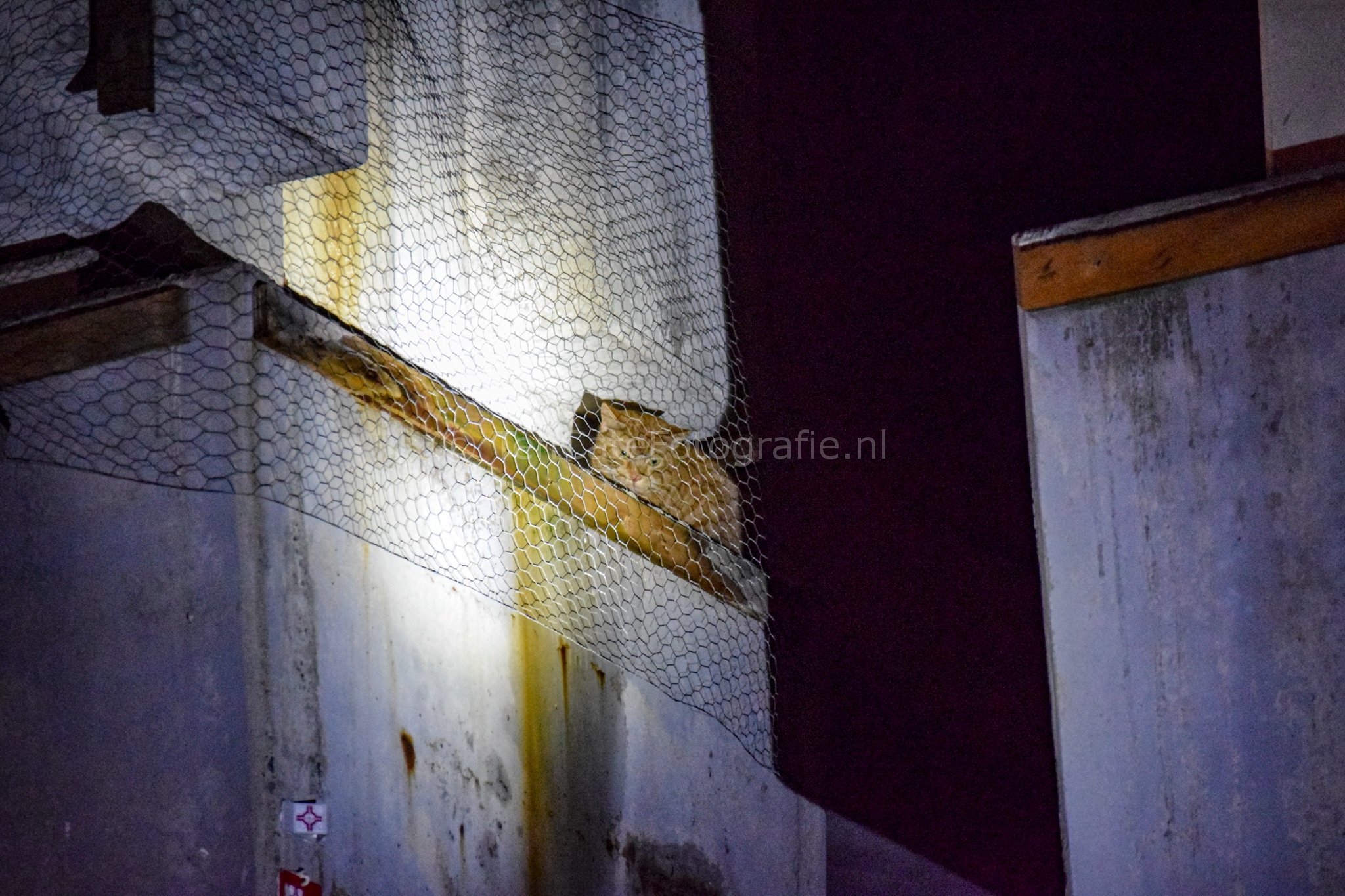 De melding van een dier in problemen kwam rond 20.50 uur bij de hulpdiensten binnen die daarop een bluswagen ter plaatse stuurden. Wat de hulpverleners vervolgens ook proberen, ze krijgen het beest maar niet te pakken. na zo’n 20 minuten bezig te zijn geweest lukte het de brandweer om met een waterstraal de kat van zijn plek te verjagen.