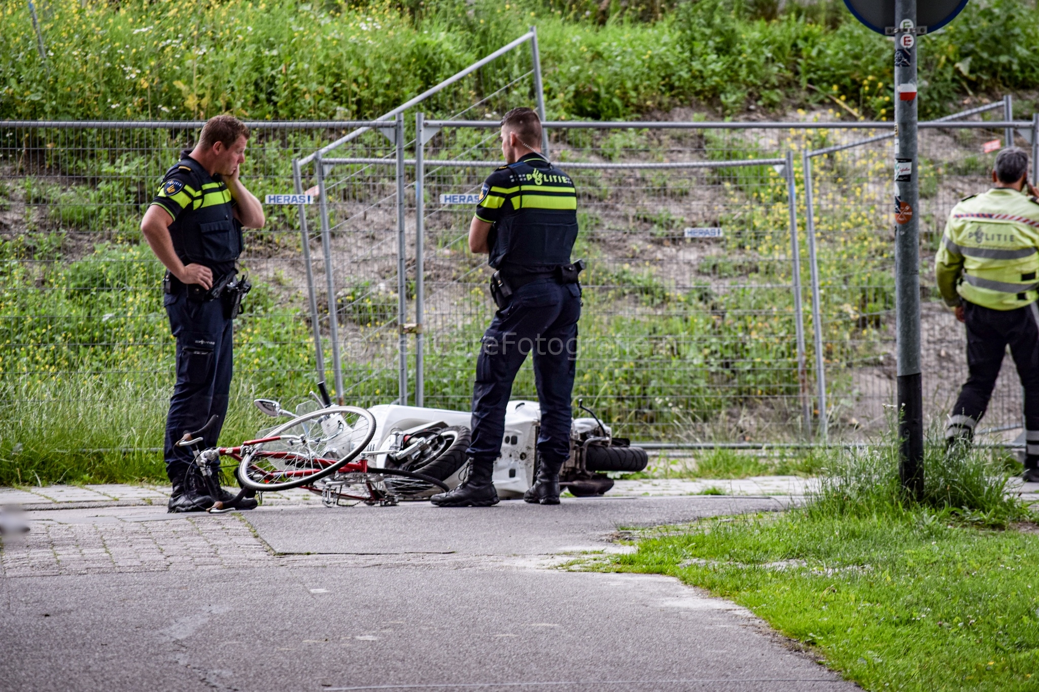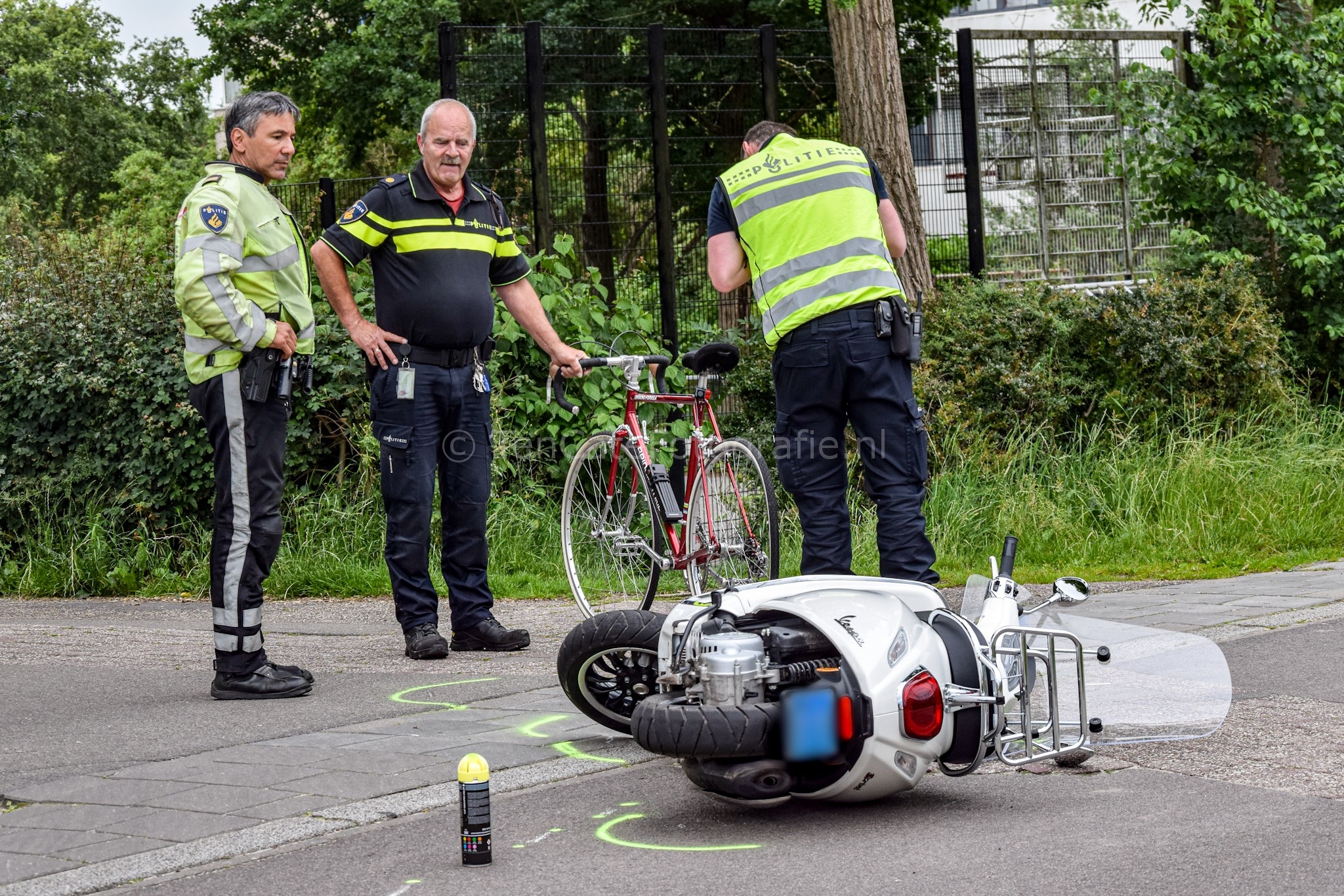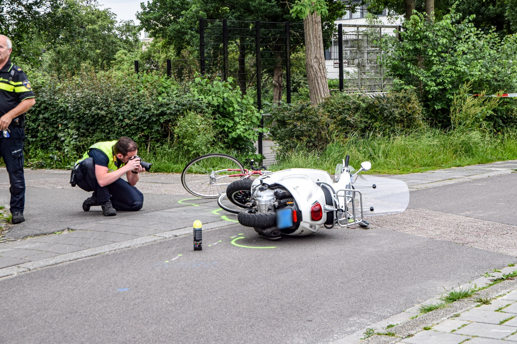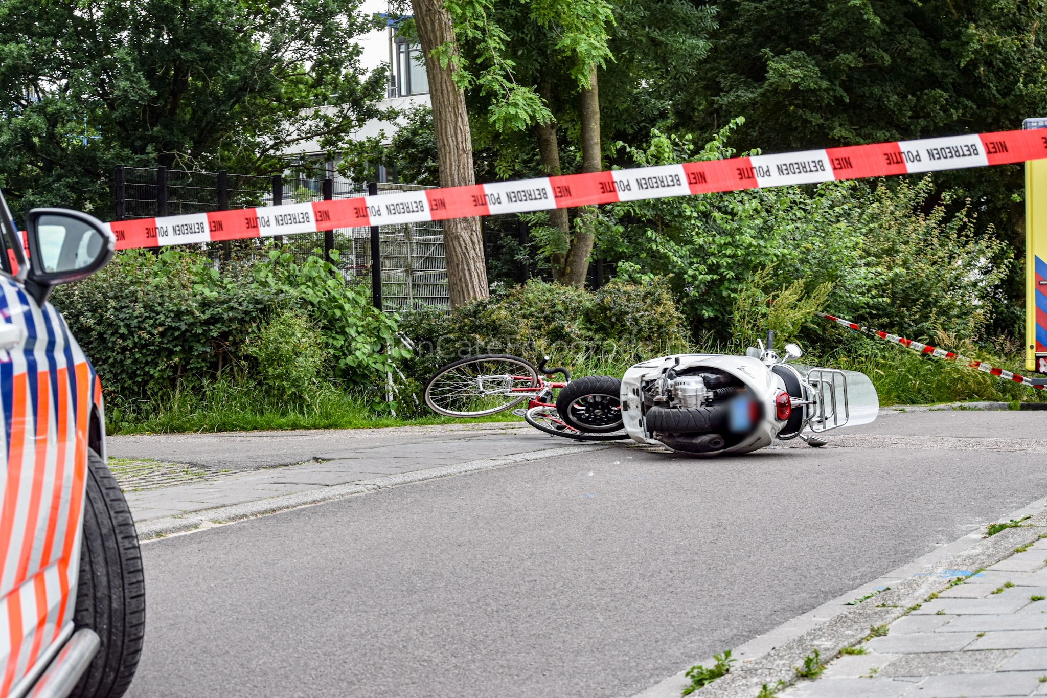 Het ongeluk gebeurde rond 17.35 uur op het fietspad tussen de Laan van de Vrede en de Muntinglaan. Door nog onbekende oorzaak zijn een fietser en een scooter met elkaar in botsing gekomen. Zowel de fietser als de bestuurder van de scooter kwamen ten val. Omstanders en politieagenten verleenden eerste hulp. Al vrij snel arriveerden er twee ambulances. Verpleegkundigen hebben de slachtoffers weten te stabiliseren. Daarna zijn ze met onbekende verwondingen overgebracht naar het ziekenhuis. Vanwege het ongeluk werd het fietspad afgesloten. De politie doet onderzoek naar de precieze toedracht. Rond 18.45 uur werd het fietspad weer vrijgegeven.