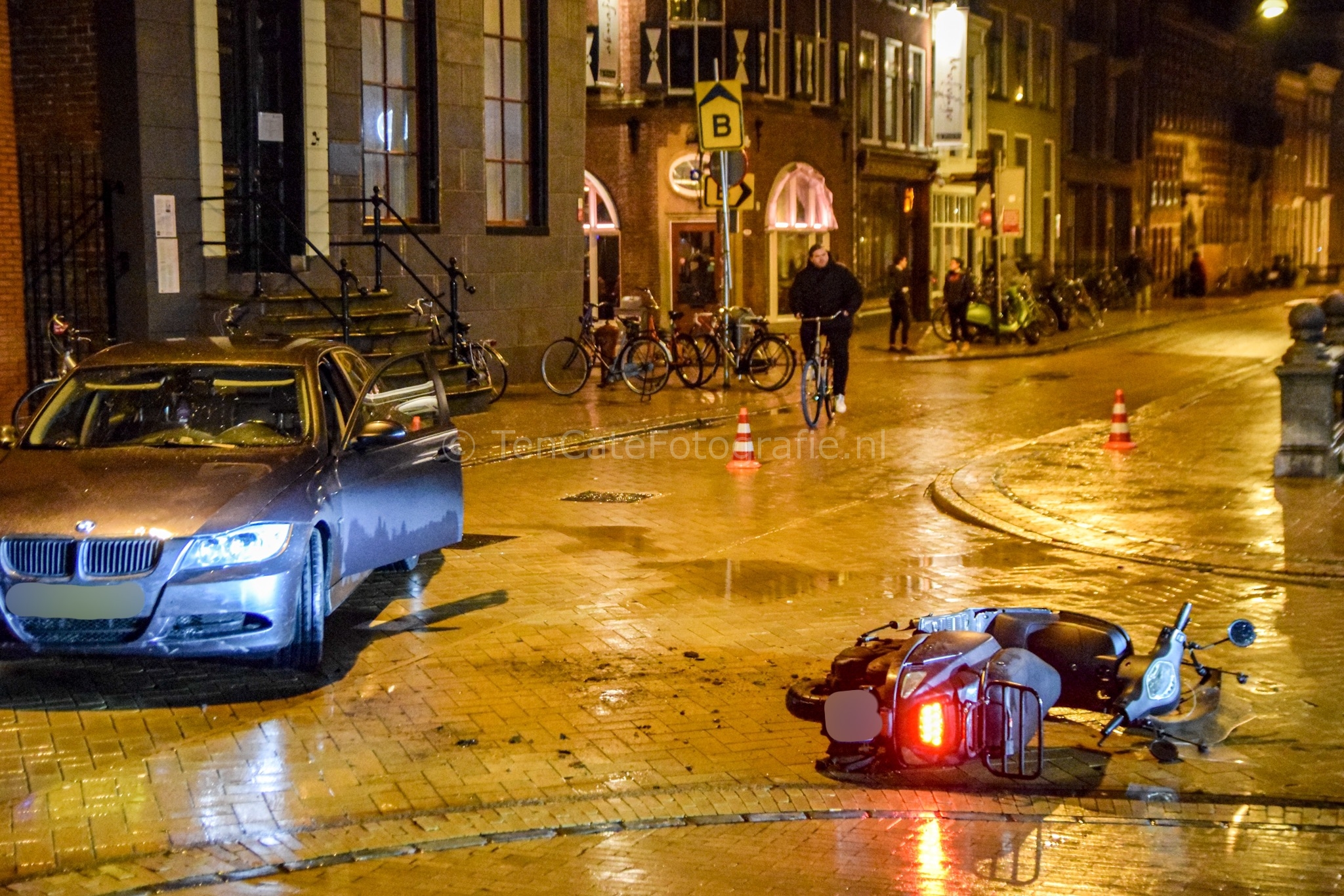 Het ongeluk gebeurde rond 23.30 uur ter hoogte van de kruising met de Rode Weeshuisstraat. Hoe het precies heeft kunnen gebeuren is onbekend. Vermoedelijk wou de auto de Rode Weeshuisstraat in rijden en zag daarbij de scooterrijder over het hoofd. Hulpdiensten waren er snel bij. Terwijl politieagenten het overige verkeer in goede banen leidden ontfermden ambulancemedewerkers zich over het slachtoffer.