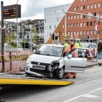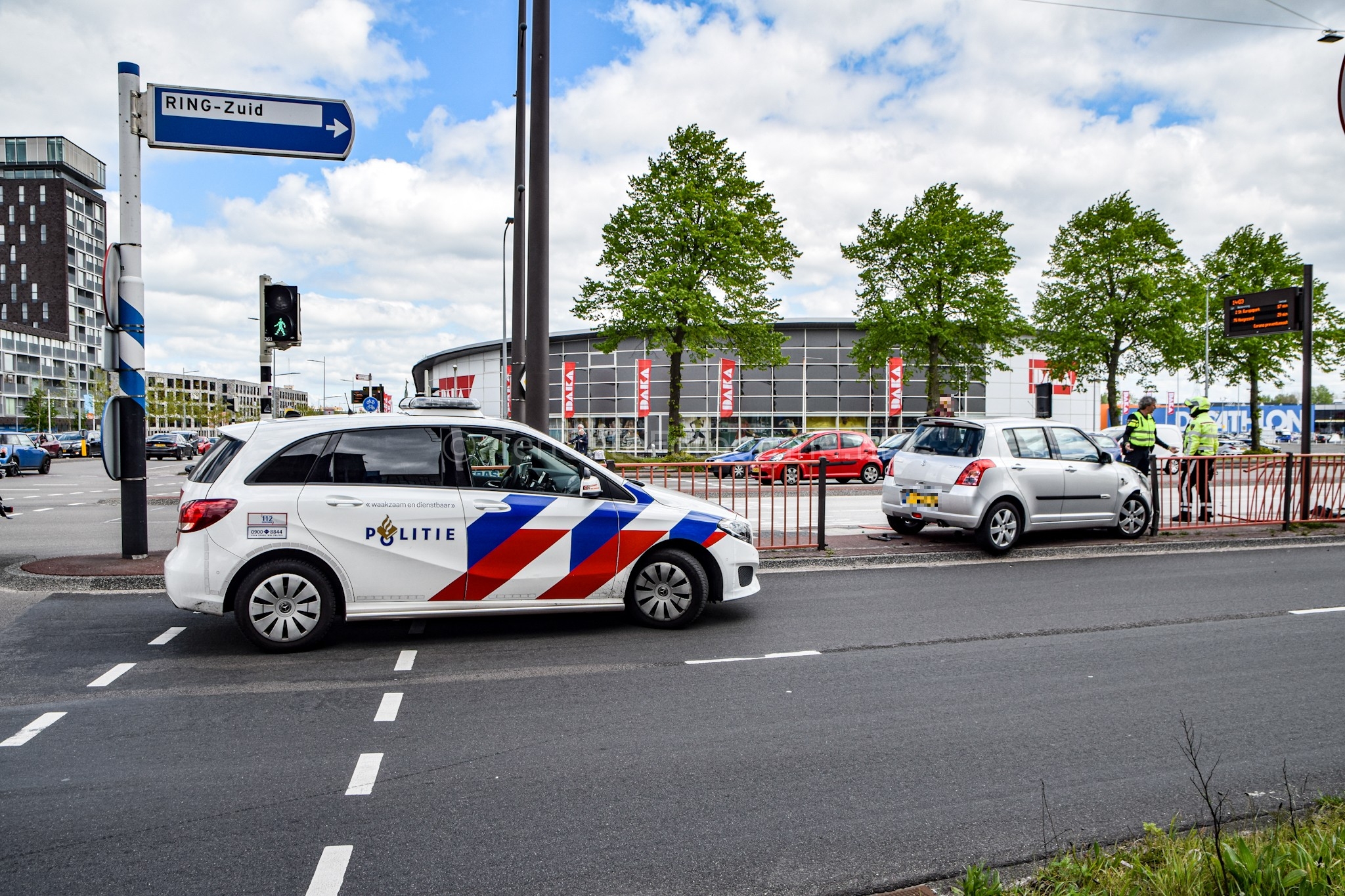 Het ongeluk gebeurde rond 13.50 uur ter hoogte van de kruising met de Sontweg. Hoe het precies kon gebeuren is onbekend. Getuigen vertellen dat de bestuurder van de auto wilde keren. Die manoeuvre mislukte waarbij de auto op het hekwerk knalde. De automobilist bleef ongedeerd. Zijn auto daarentegen raakte zwaar beschadigd en moest worden afgesleept door een bergingsbedrijf. Vanwege het ongeluk is één rijbaan richting de Euroborg afgesloten.